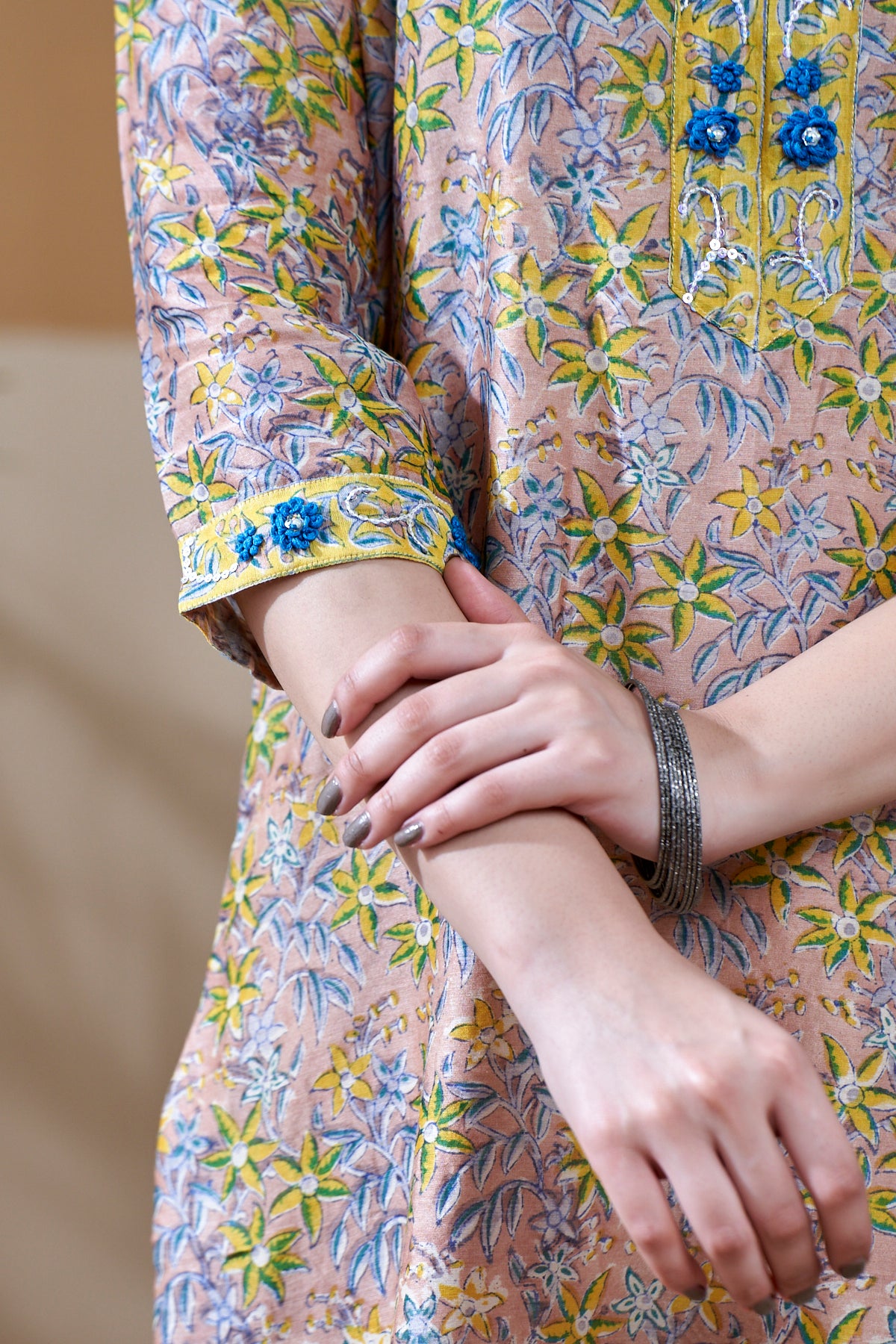 Kurta :- Grey Hand Block Printed Chanderi Kurta with Lining .