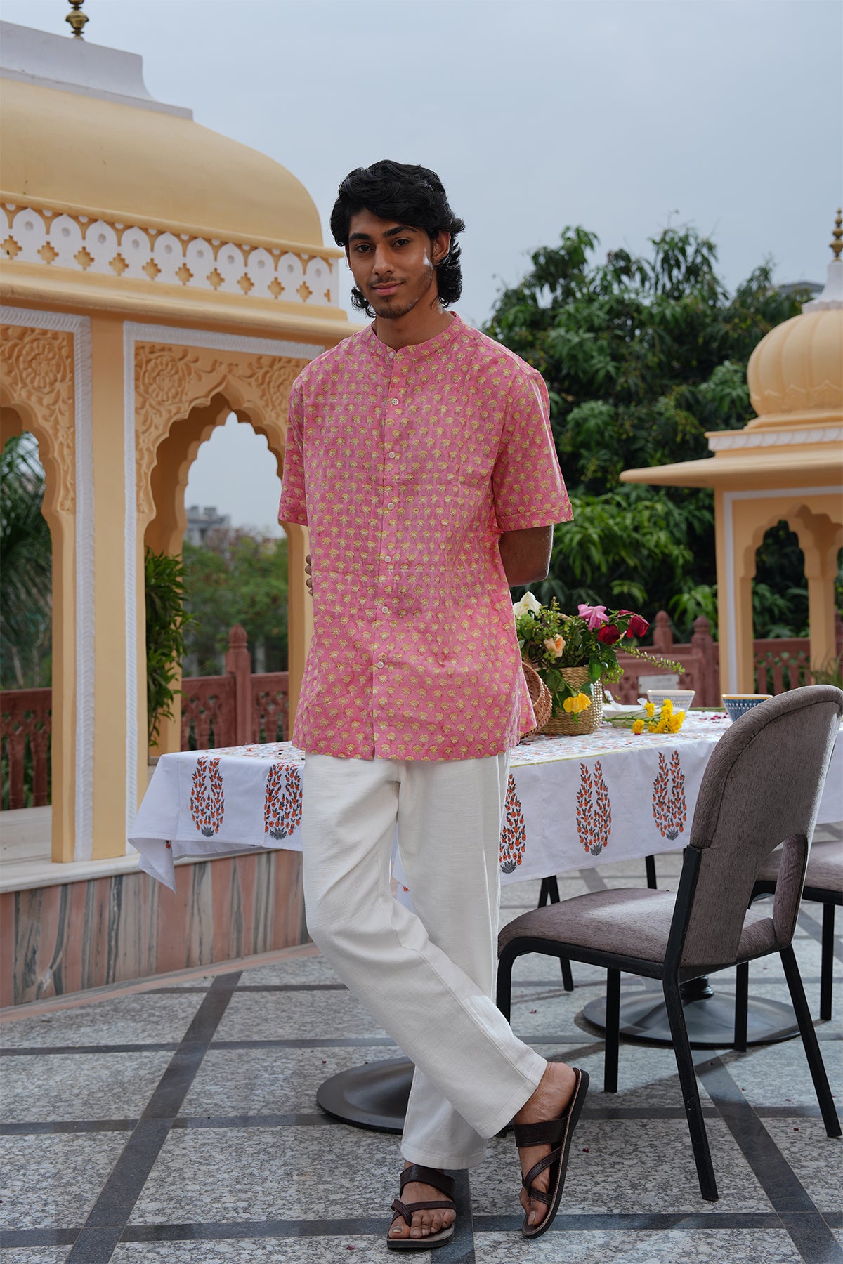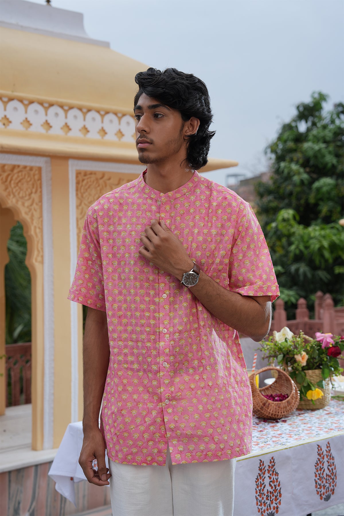Shirt :- Pink Hand Block Printed Cotton Dobby Half Sleeve Shirt