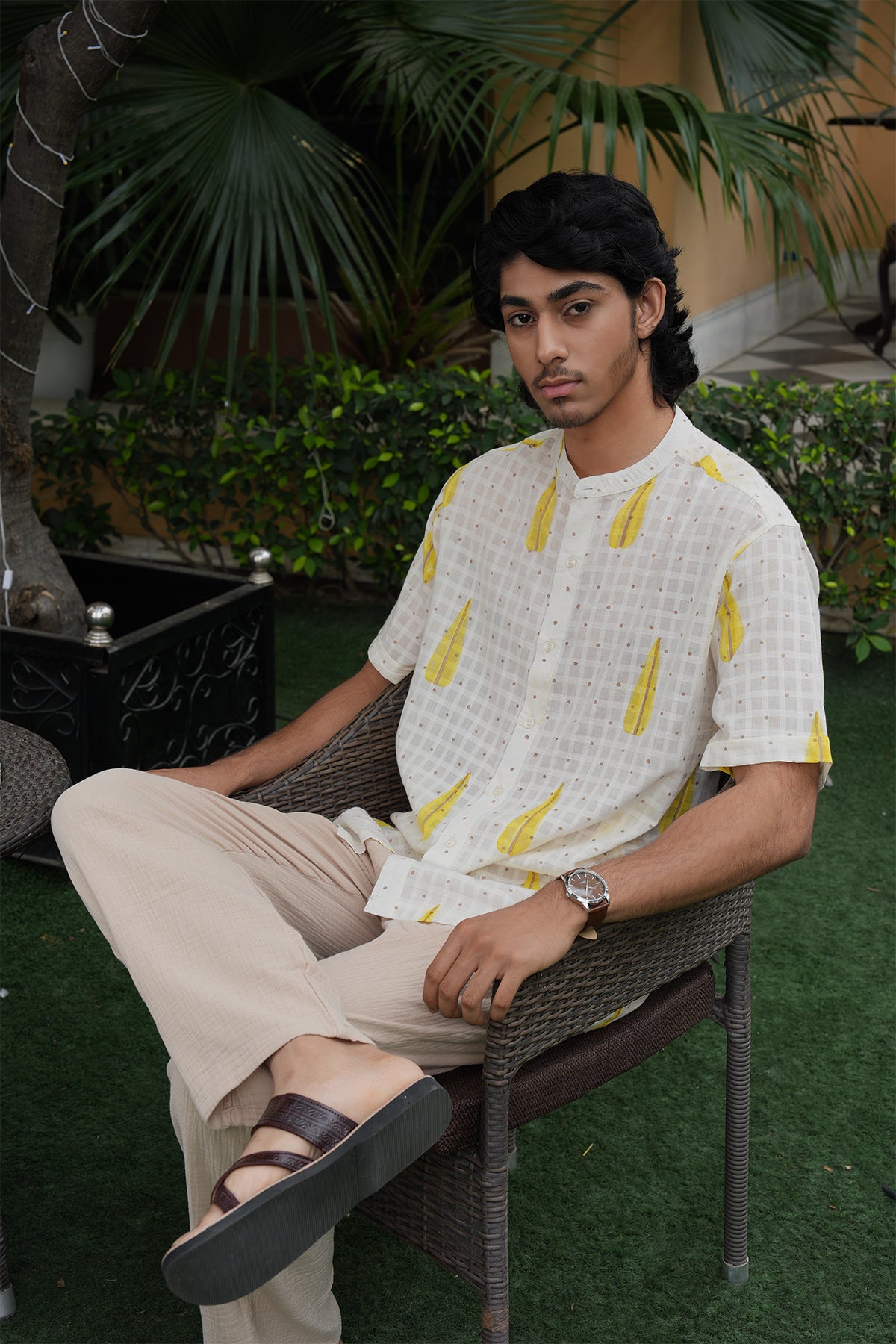 COLOUR: White / Yellow Neck :- Band Collar Sleeve :- Half Sleeve Fit :- Regular Fit
